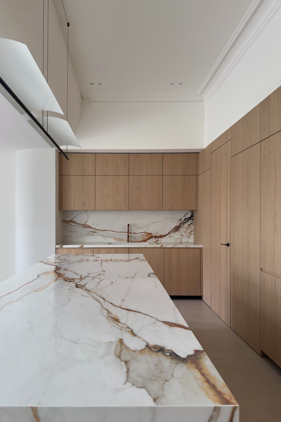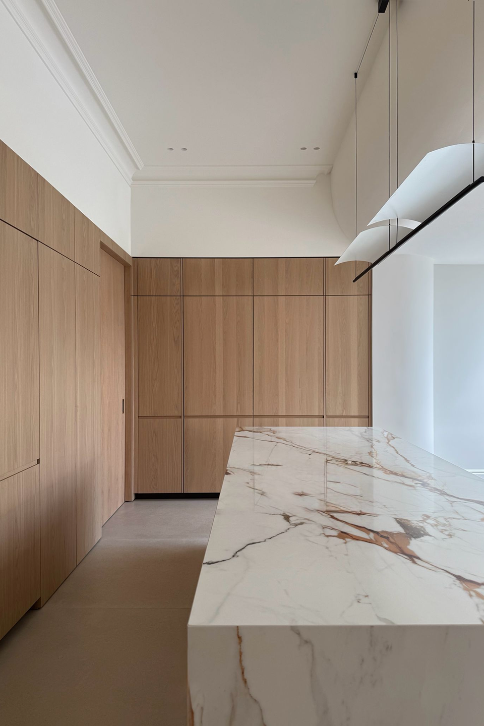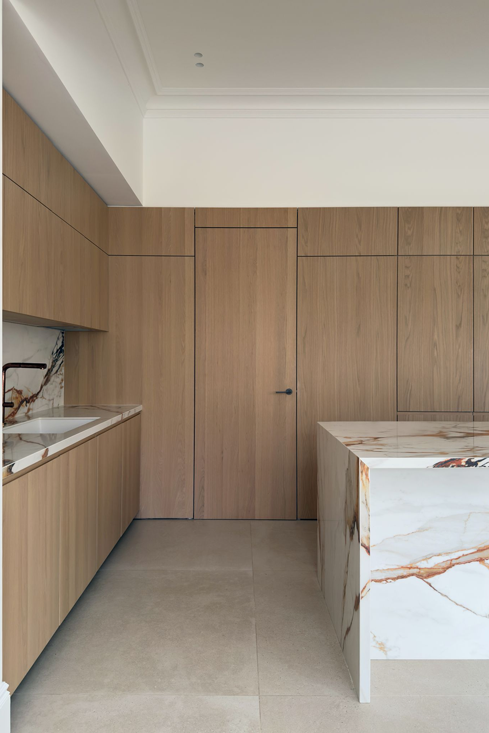 Designed in collaboration with Alez Architects, this kitchen embraces clean geometry and natural materials. The handleless oak-veneered cabinetry creates a calm and refined visual flow. A concealed door leads through to a utility space, maintaining a seamless architectural rhythm. The waterfall-edge island introduces sculptural elegance.